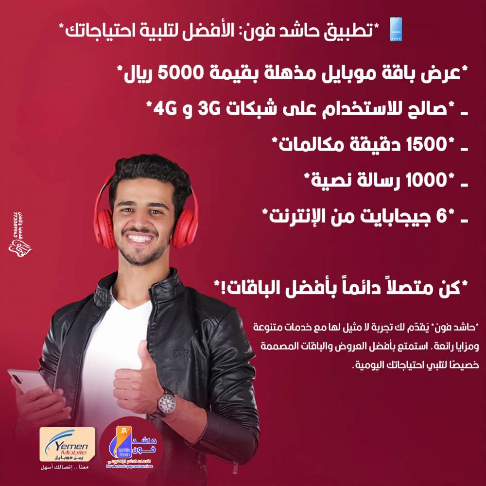 تقوم حاشد فون بتقديم خدمات جميع شبكات الاتصالات اليمنية من إضافة دقائق اتصال او حزم باقات الانترنت لأرقام الهواتف وتفعيل حزم الانترنت وذلك عبر الروابط الممنوحة لنا من شركات الاتصالات اليمنية .